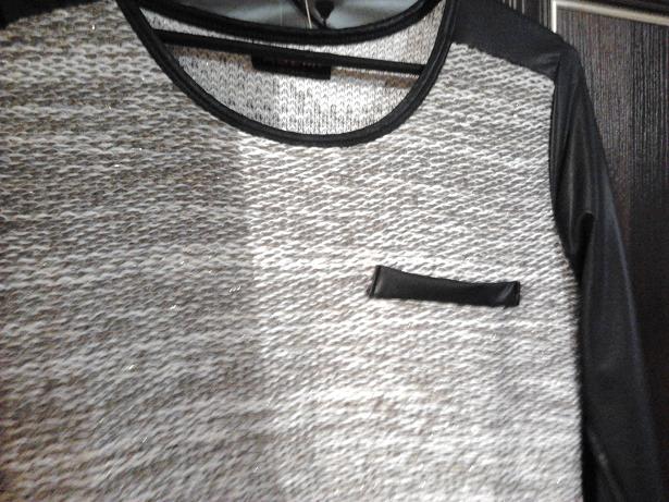 Do tego zakupiłam też śliczny elegancki sweterek, szary, który ma również dodatki skórzane i srebrną nitkę co stanowi niezwykle modny szyk. Sweterek i spodnie są na sprzedaż. Mam dostęp do spodni w rozmiarze M-XL. Osoby zainteresowane proszę o kontakt.
